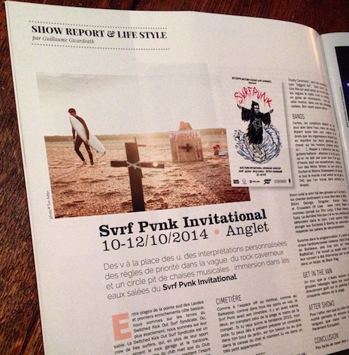 – Abus Dangereux face 134 (janvier 2015) : en rubrique « Show report & life style » (spécialement créée pour l’occasion, j’en ai bien peur), j’ai fait une page de compte-rendu du Svrf Pvnk Invitational (à lire en version blog ici-même). Et peut-être un ou deux autres trucs.