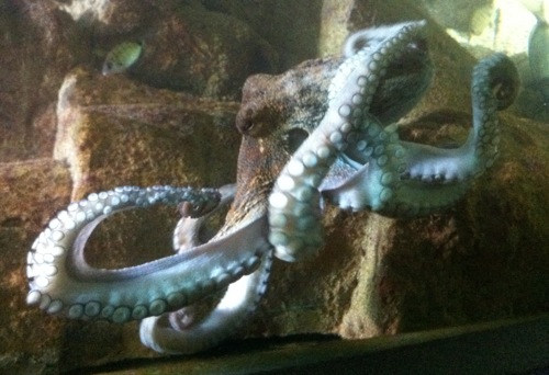 Ne me demandez pas dans quels genres d’endroits j’aime bien traîner, mais je rencontre encore souvent des gens se demandant à haute voix quelle est la différence entre le poulpe et la pieuvre. Bien sûr, c’est la même chose. « Octopus vulgaris » est-il marqué dans les deux cas sur la carte grise. J’ai de bons souvenirs de poulpes de mes plongées au Cap Béar, en Méditerranée. Ce sera un motif pour un de mes prochains gros tatouages (j’ai déjà fait la méduse). Le poulpe est un animal qui s’apprivoise fort bien paraît-il, et serait même très attachant. Je pense, par ailleurs, que les céphalopodes sont en pole position pour dominer la planète Terre après l’extinction prochaine de la race humaine. Leur céphalisation est déjà bien avancée et y’a d’là place dans leur grosse tête pour des évolutions futures, et ils sont bien sûr bien armés pour assurer différentes activités grâce à leurs tentacules et ventouses (déplacement, préhension, combat, etc.). J’ai déjà un pote qui s’appelle Skidz, tous mes autres potes s’appelleront squids !