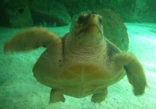 Il y a des tortues de mer dans le bassin dit « des grandes espèces », mais des tortues luth il y a seulement un moulage, d’un spécimen qui avait été récupéré sur la plage, mais qui est mort dans les 48 heures. C’est un spectacle que l’on peut voir seulement dans les documentaires animaliers, mais ce qui me touche le plus, c’est ce moment, sur le sable, où l’oeuf s’ouvre sur une vie de dangers, et où chaque heure, chaque minute, chaque seconde même, est un instant où battent côte à côte l’espoir et la terreur, à pleine mesure, sans doute ce sentiment que l’on appelle « aventure ».