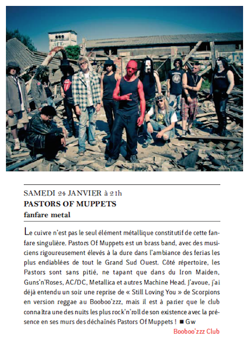 Hey, comme je l’ai posté sur le site Bordeaux Concerts, la fanfare Pastors Of Muppets joue au Booboo’zzz (Bordeaux) ce samedi 24 janvier.
