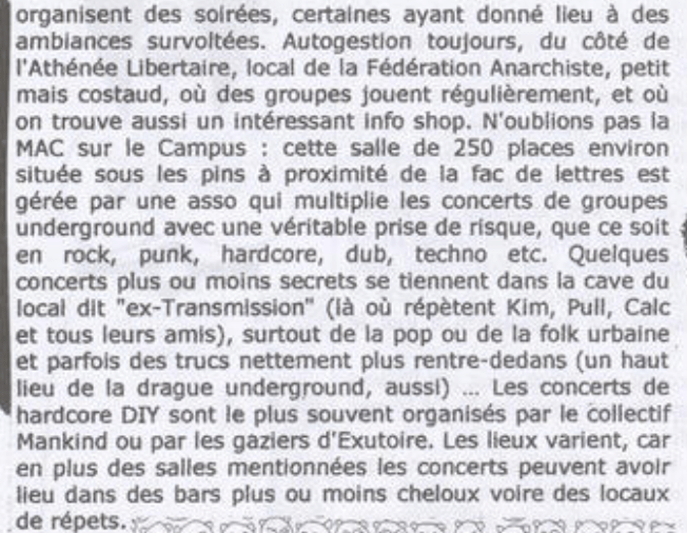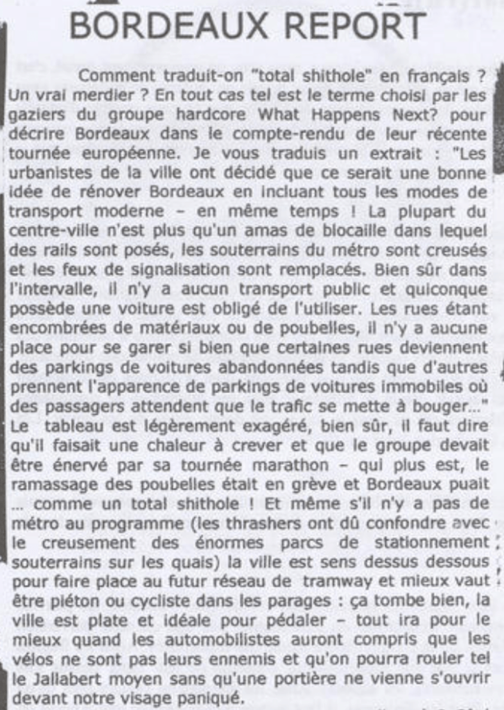 Pour le numéro de mars 2004 (n°7 de l’ultime série, avec Siouxsie Sioux en couverture), Patrice m’avait demandé de rédiger un “scene report” consacré à Bordeaux. Evidemment, je m’étais fait défoncer par tous ceux que je n’avais pas pu citer (un grand classique de l’exercice).