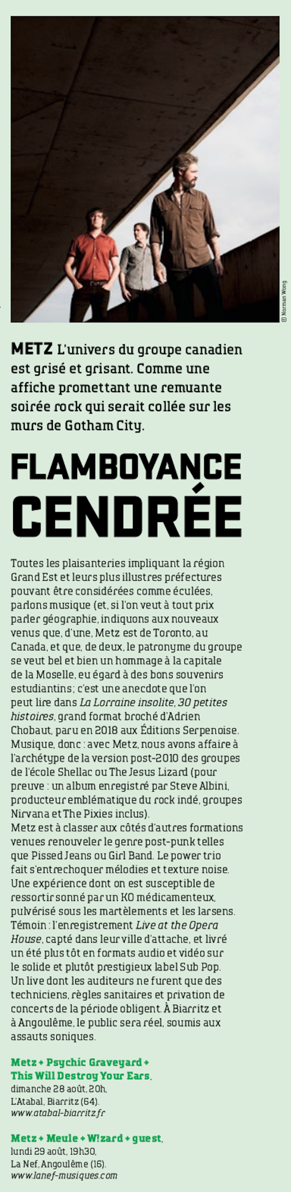 La tournée d’été du groupe Metz (Canada) passe par Biarritz et Angoulême. Voici un papier que j’ai écrit pour le journal Junkpage à cette occasion :