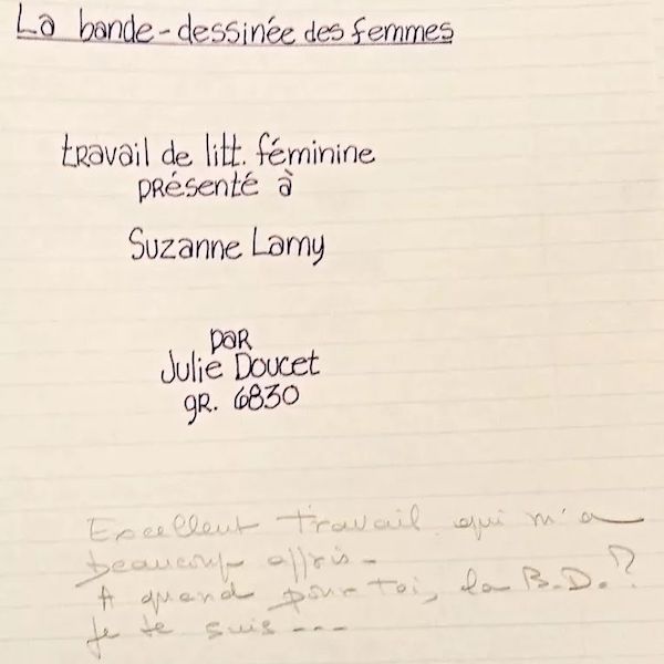 On y verra de nombreux documents inédits et (sans doute) hallucinants, comme (par exemple) cette appréciation sur un devoir de Julie Doucet effectué dans le cadre de son enseignement en arts au Cégep du Vieux-Montréal (en 1985, je dirais) – cet aperçu est une photographie interceptée par mes soins sur un réseau social d’un organisateur clé :
