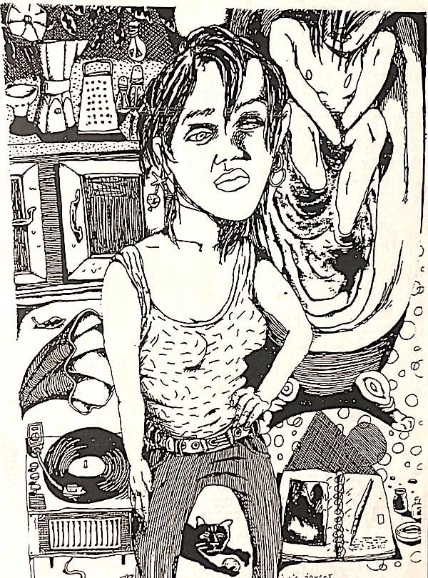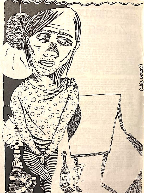 Je crois que la première fois que j’ai vu Julie Doucet publiée en France, c’était pour deux « (très jolis) dessins » insérés dans la rubrique « Pictures Zines » du fanzine Tokbomb de Saint-Etienne (n°1, 1990) :