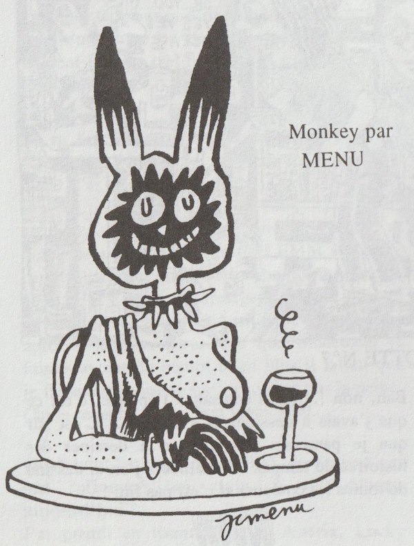 Ci-dessous, voici Monkey, le personnage emblématique de Julie Doucet, tel que JC Menu s’en est emparé pour un hommage publié chez Chacal Puant (Monkey And The Living Dead, 1994) :