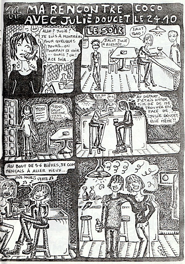 Ici, en 1992, dans son cool fanzine Snack Attack, la française Corinne « Coco » racontait sa rencontre avec Julie Doucet à Montréal :