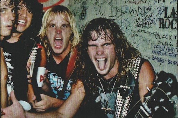 Modèle : Jeff Hanneman (Slayer) avec les trois autres membres du groupe dans les loges du Ruthie’s Inn (Berkeley, Californie), en 1984. C’est une photo de Harald Oimoen que j’avais repérée dans le livre Murder In The Front Row paru chez Bazillion Points.