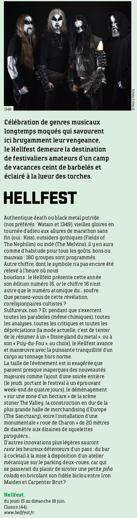Autre chiffre, dont le symbole n’a pas encore été relevé à l’heure où nous bouclons : le Hellfest présente cette année son édition numéro 16, or le chiffre 16 n’est autre que le numéro atomique du… soufre. Que pensez-vous de cette révélation, coreligionnaires cultistes ? Sulfureux, non ? Et pendant que s’exercent toutes les paraboles (même chimiques), toutes les analyses, toutes les critiques et toutes les dépréciations (la mode actuelle, c’est de tenter de le résumer à un “Disneyland du metal”, ou à son “Puy-du-Fou”, au choix), le Hellfest avance et manœuvre avec la puissante tranquillité d’un cargo au tonnage hors normes.