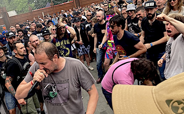 Cool T-shirts DS-13 pour le batteur et Asshole Parade pour le chanteur : on voit bien les racines hardcore du groupe. Ils ont d’ailleurs joué des titres de leurs débuts plus hardcore, comme “A coup de gégène” extrait de leur démo (et terminé leur set par une reprise de Negative Approach). Interprétation émouvante de “Contre vents et marées” : le chanteur explique qu’il a cru mourir d’un cancer récemment et dédie la chanson à tous ceux qui ont failli crever. Le public est ainsi harangué : “C’est bien de venir au Hellfest une fois par an mais faites des trucs dans vos villes, localement, ce serait un peu mieux quand même”. A noter : premier circle pit avec gwenadu de la journée.