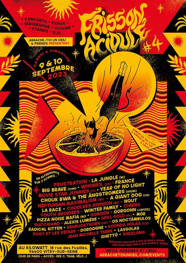 Le duo d’artistes visuels et de sérigraphes réunis sous le sobriquet Arrache-toi un œil (avec l’aide de leur armée secrète de supplétifs) ont réussi leur pari : un week-end de concerts en banlieue sud de Paris, dans le Val-de-Marne, samedi 9 et dimanche 10 septembre 2023, avec une très bonne ambiance propice aux rencontres et aux retrouvailles, une régie générale fluide et efficace et une grande variété dans les styles programmés, ce qui est toujours appréciable pour ouvrir son esprit. Comme le dit la militante Valérie Pécresse : « Non aux ghettos ! »