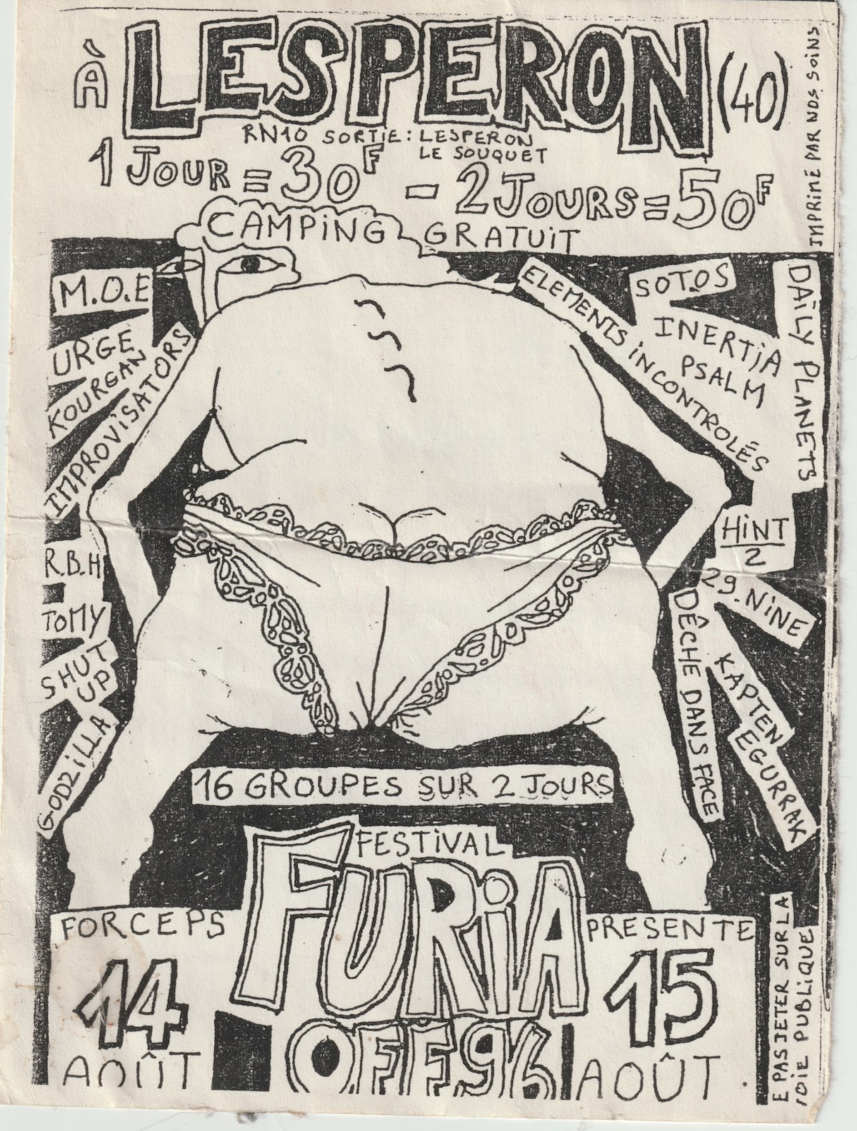 J’ai retrouvé ce flyer du festival Furia Off de l’été 1996, au cours duquel j’avais vu pour la première fois le groupe, sous leur ancien nom de Godzilla (il me semble qu’ils avaient joué sous le kiosque à musique de la commune). C’était à Lesperon, à environ une heure de route au nord de Ondres – on avait campé sur le stade municipal qui avait ouvert douches et vestiaires pour l’occasion, que de bons souvenirs…