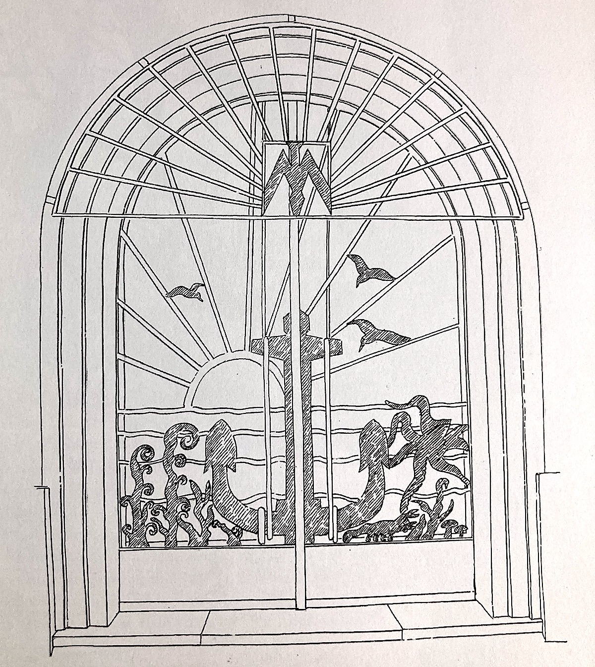 • Ci-dessous : dessin par Dominique Duplantier de la grille de la porte d’entrée de l’Inscription Maritime à Bayonne (frères Gomez architectes, 1933), bâtiment qui héberge actuellement le Didam, lieu de l’exposition rétrospective (photographie d’un détail d’une page du livre Bayonne, ville d’art et d’histoire disponible aux éditions Koegui) :
