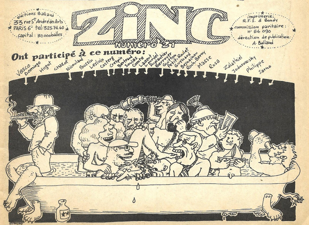 J’ai pu aussi un peu évoquer avec Dominique Duplantier la (courte) carrière de dessinateur de bande dessinée qu’il eut grâce à des publications de la fin des années 70, celles de l’école de la free press qui participa à la révolution du dessin de presse et de l’écriture journalistique. Voici par exemple Duplantier crédité dans l’ours du n°21 du mensuel pionnier de bande dessinée d’avant-garde underground française Zinc (1974), dans une scène très crumbienne de baignoire créatrice, signée Nicoulaud, aux côtés de prestigieuses signatures : Jodorowsky, Soulas, Jackie Berroyer, Francis Masse, Pierre Guitton, etc.
