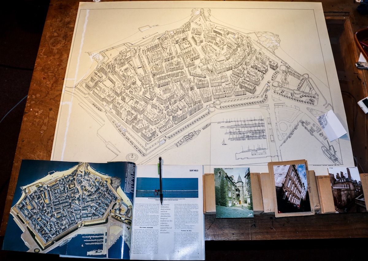 Dès mon retour à Ondres, j’ai téléphoné à tous mes contacts qui savaient tenir un crayon… et j’ai monté un atelier, d’abord dans mon propre grenier, puis à Bayonne, rue de la Monnaie. On a commencé par livrer les plans de Saint-Malo, puis Rennes, Nantes, Quimper, Concarneau, Nîmes, Avignon, Marseille, etc.