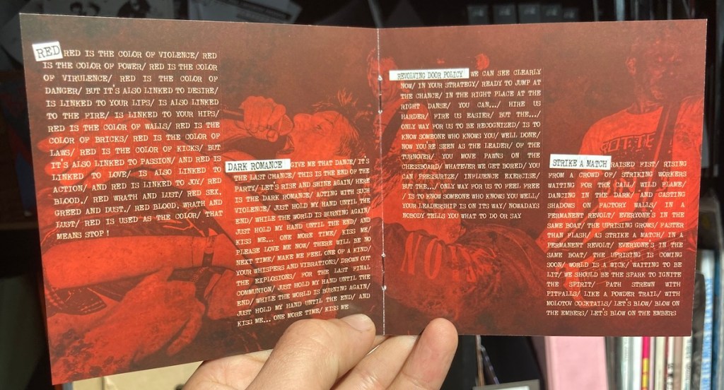 Photos noir & blanc : Eric Guyot a.k.a. Topfuel Deluxxxe. Ce sont ses photos qui sont utilisées dans le livret. Elles servent de fond et les paroles sont imprimées dessus, pour un résultat très hardcore classieux. Si j’ai bien lu, figurent aussi, sur les autres pages, des photos de Marie d’Emm et de Brice Lambert.