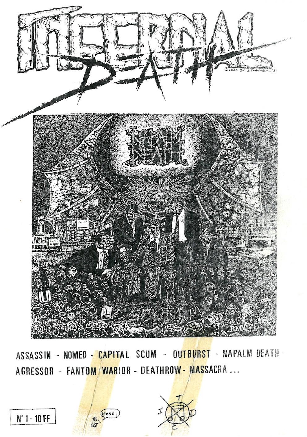 Ci-dessus, c’est la couverture de Infernal Death, un des tout premiers zines français dans lequel j’ai pu lire une interview de Napalm Death alors que Scum venait tout juste de sortir. Je suis en photo à l’intérieur de ce zine, arborant un sweat-shirt de Motörhead à la gloire du concept d’Orgasmatron (et non pas du concept d’orgasme, ça viendra plus tard dans ma bio).